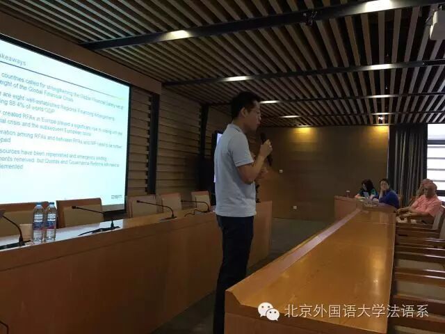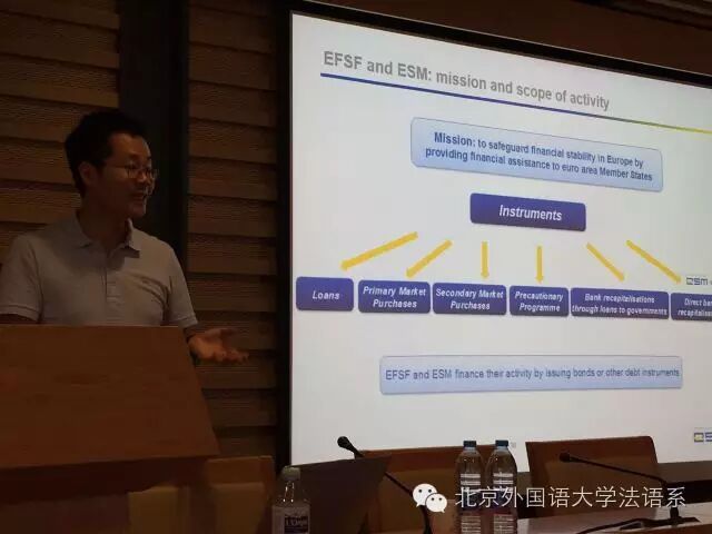 2016年6月3日周五上午十点,应法语国家与地区研究中心主任、北外亿阳冠名教授丁一凡教授的邀请,现就职于欧洲稳定机制(European Stability Mechanism)的程功博士在北外图书馆三层学术报告厅用法语为我系师生做了题为“区域金融防火墙的运行机制”(Les mécanismes financiers régionaux dans le filet de sauvetage financier mondial)的讲座。本次讲座为法语国家与地区研究高端论坛第十六讲,由法语系党总支书记兼副主任戴冬梅老师主持。