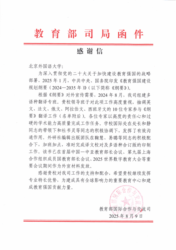 近日,教育部国际合作与交流司向我校发来感谢信,感谢在《教育强国建设规划纲要(2024-2035年)》的对外翻译工作中,我校五个语种的多位专家及国际处给予的大力支持。