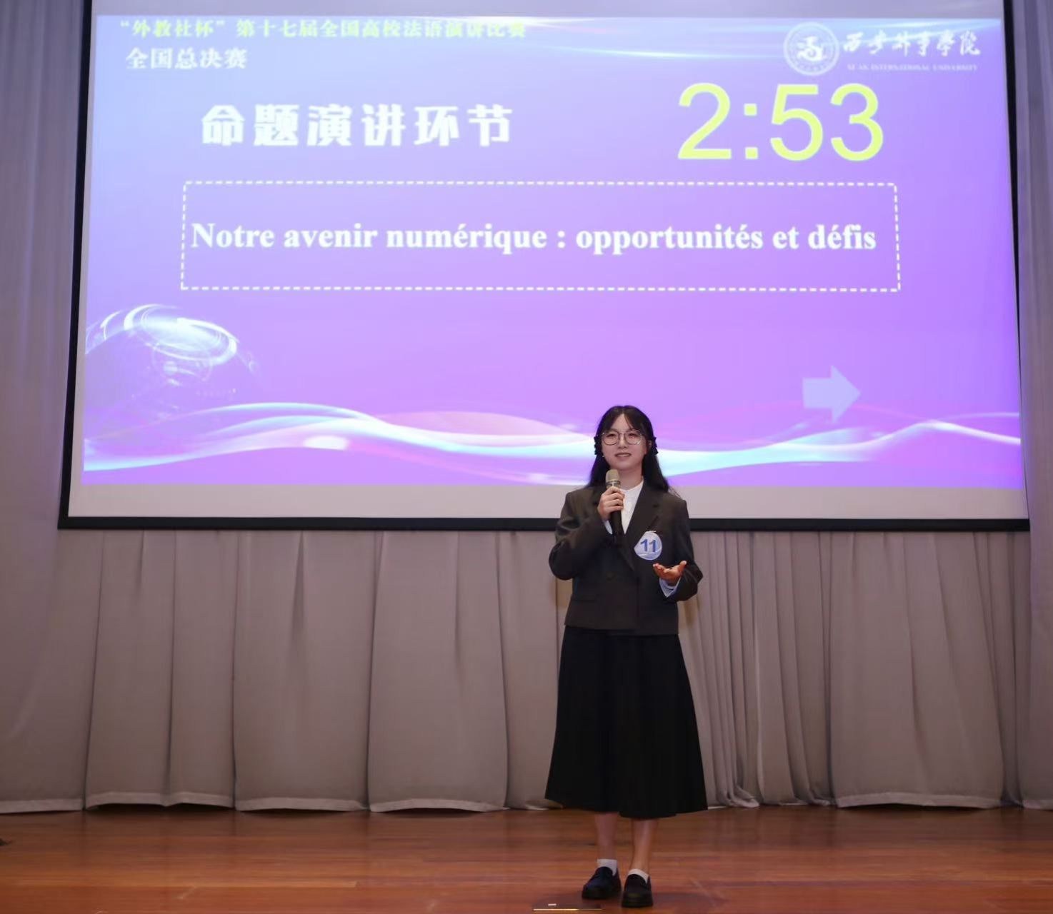 “外教社杯”全国高校法语演讲比赛是我国法语教育界最具影响力的赛事之一。本届比赛由全国法国教学研究会主办,初赛阶段由各理事单位高校择优推荐一名选手参赛,经过严格筛选,最终来自全国各地的12名优秀选手从102名初赛选手中脱颖而出,入围在西安举行的全国总决赛。决赛赛制分为两个环节:三分钟主题演讲和三分钟即兴演讲,全面考察选手的语言功底、逻辑思维和临场应变能力。